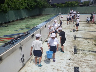 いよいよ水泳学習の季節がやってきました。3年生以上の児童が分担を決めてプール清掃をしました。3・4年生はプールサイドの掃除などを、5・6年生はプールの中の掃除などをしました。みんなで力を合わせて掃除をしたので、プールがとてもきれいになりました。