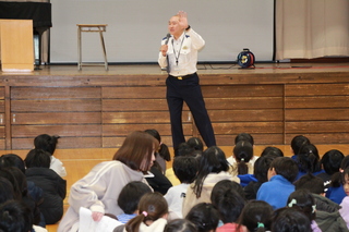学校に不審者が入ってきた時、どのように避難をして命を守るかという訓練を行いました。今年度は、警察の方に不審者役を行っていただき、教員が子供たちの命を守るにはどうしたらよいか、どのようにさすまたを使うのかなどの御指導をいただきました。また、子供たちが体育館に避難した後、防犯教室を行いました。学校で不審者が現れた時の対応の仕方のほかにも、下校の時に不審者が現れるのが多く不審者が近づいてきたら、大人を呼ぶ、子ども110番の家に逃げるなどの対応の仕方を教えていただきました。
