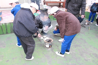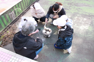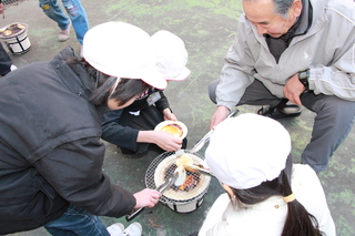 3年生が社会科の学習「道具とくらしのうつりかわり」の一環として、七輪体験を行いました。地域の方々11人が来校して、それぞれのグループに分かれて七輪の使い方を教えてくださいました。風がなく、おだやかな日でしたのでちょうどよく七輪の火をおこすことができました。おこした火でおせんべいを焼き、しょうゆをつけて食べました。子供たちは焼きたてのおせんべいを「おいしい、おいしい。」と言いながら、食べていました。