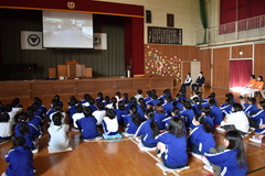 4時間目は5、6年生。体育館で一時停止の大切さやなぜヘルメットを着用するのか映像を見ながら学習しました。