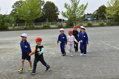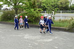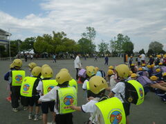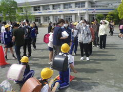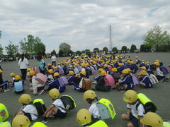1年生は初めての避難訓練。防災頭巾の被り方や避難経路を確認しました。